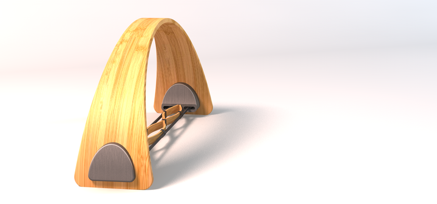 Der Bambusbogen ist formal so geschnitten, dass er bequem an der oberen dünnen Stelle getragen werden kann. An den breiteren Enden befinden sich die Metalladapter, die den Bogen spannen.