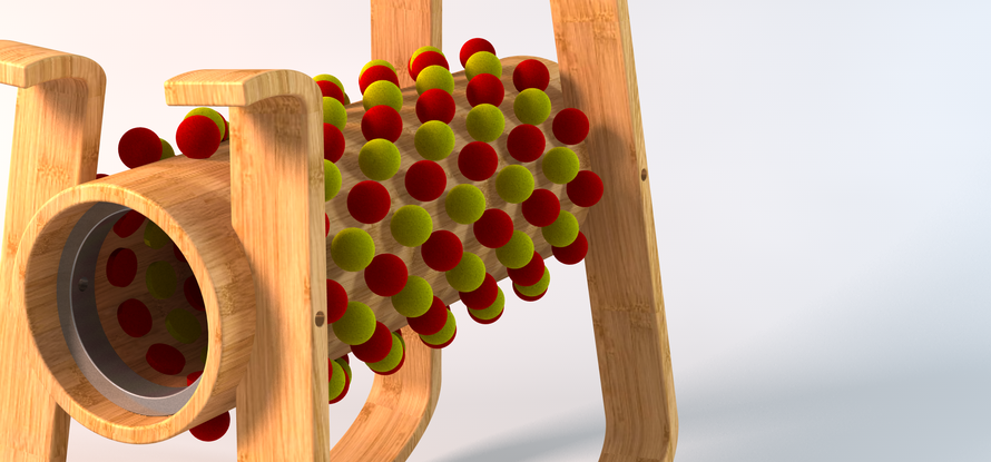 Demnach ist das Sitzrohr in der Mitte auf beiden Seiten leicht schräg eingeschlitzt. In diese Nuten werden die gebogenen Formhölzer eingesteckt und über den Metallring mit zwei Inbusschrauben verbunden. Die Schaumstoff-Sitznoppen werden von innen durch das Bambusrohr gesteckt und dehnen sich an der Außenfläche wieder aus.